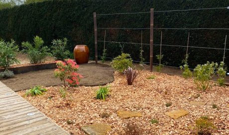 Votre paysagiste a réalisé l’aménagement d’un espace d’entrée accueillant avec un massif de plantes graminées, vivaces, couvre sol, arbustes et paillage en plaquette forestière, une jardinière en bordures corten et des pas japonais traversant le massif. Junet paysage a monté une structure en...